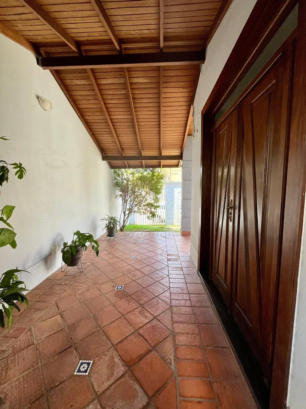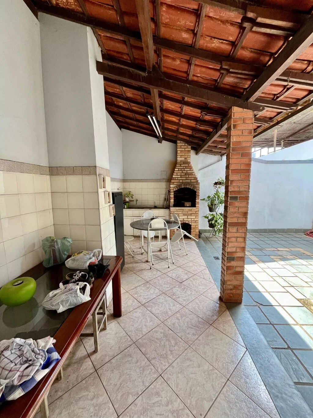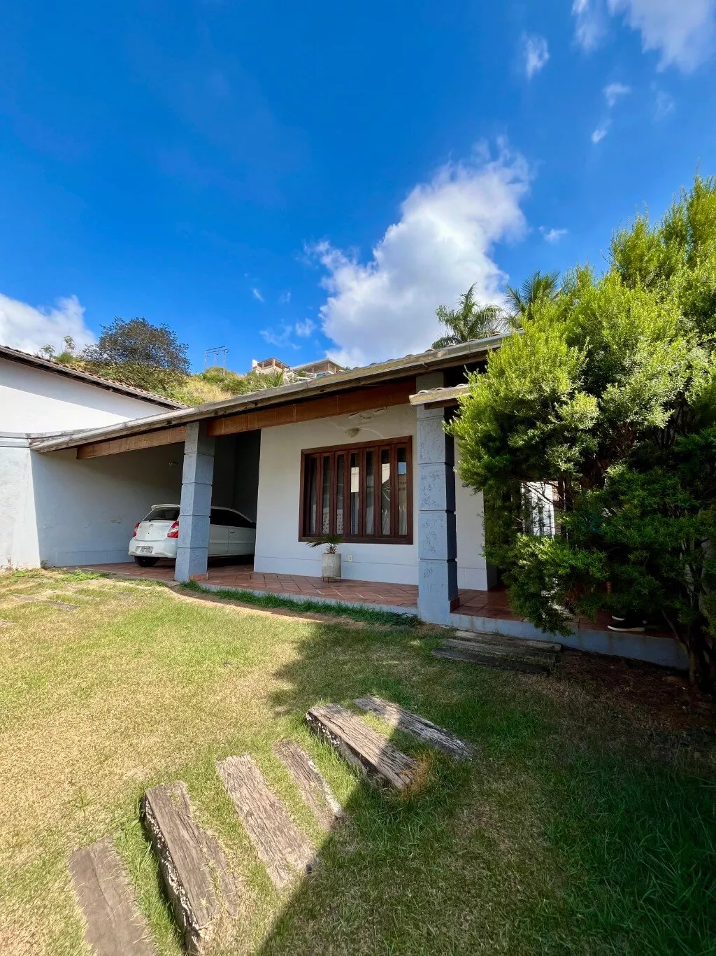 Área de churrasco, jardim na parte da frente da casa, garagem para 04 carros sendo dois cobertos.