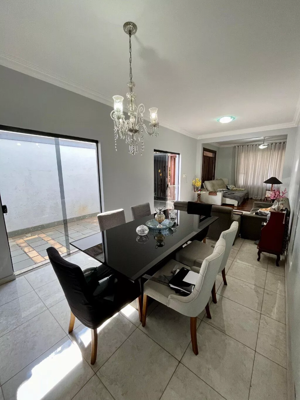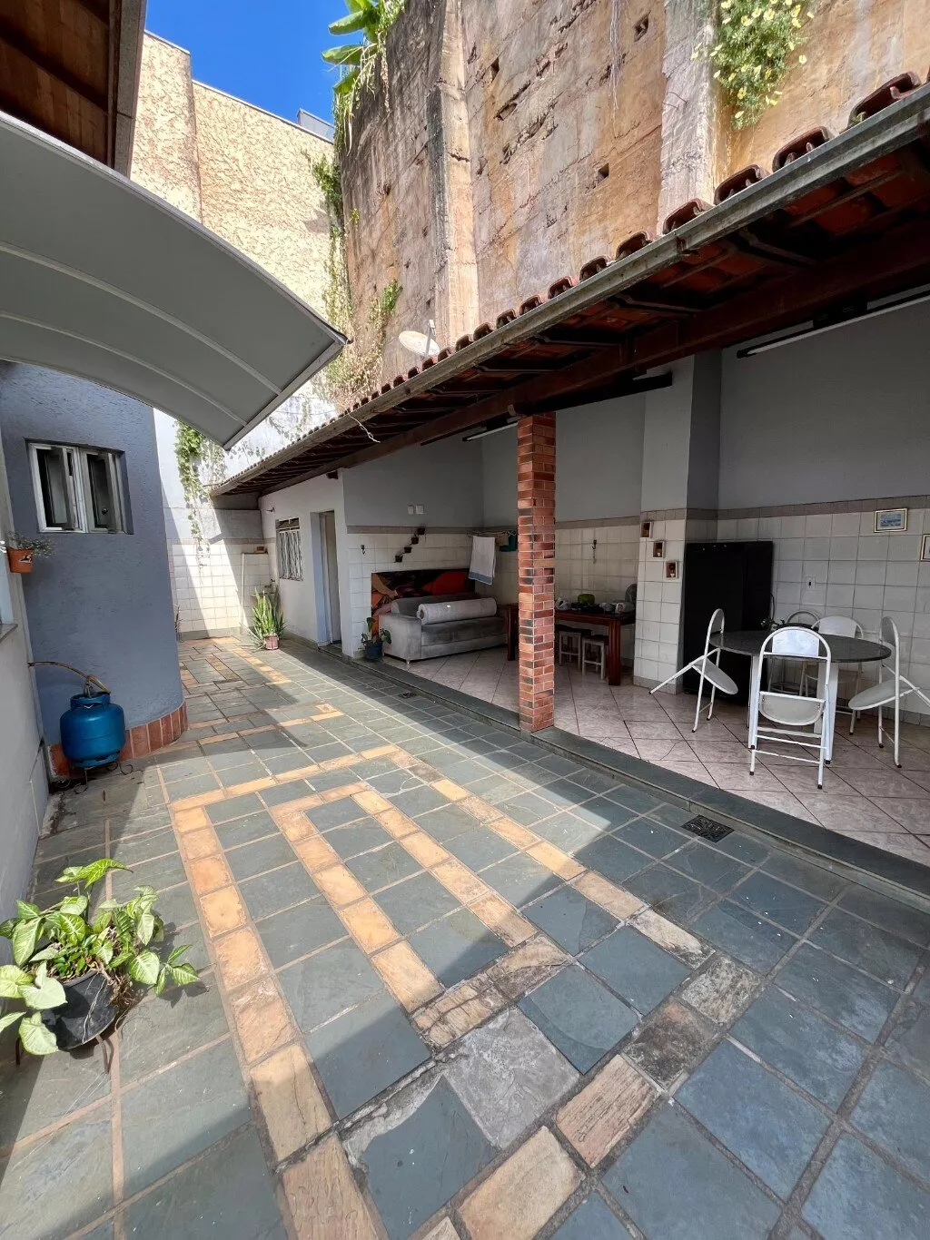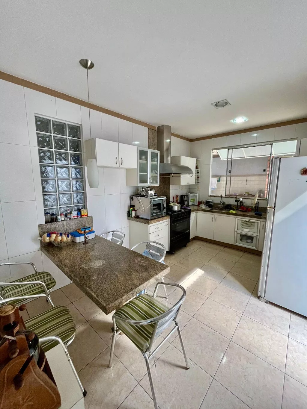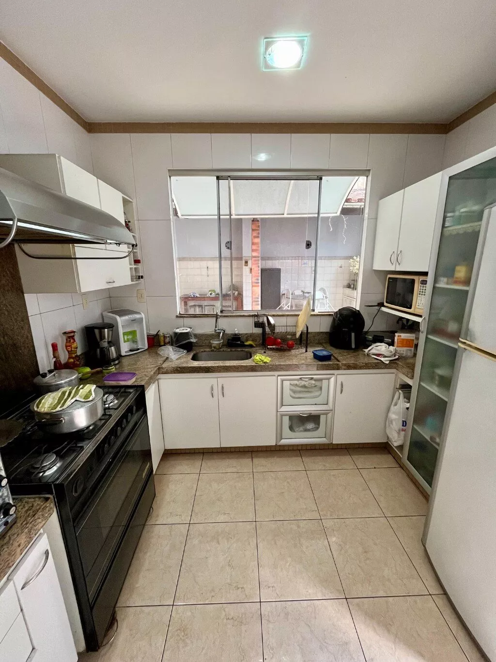Área de churrasco, jardim na parte da frente da casa, garagem para 04 carros sendo dois cobertos.