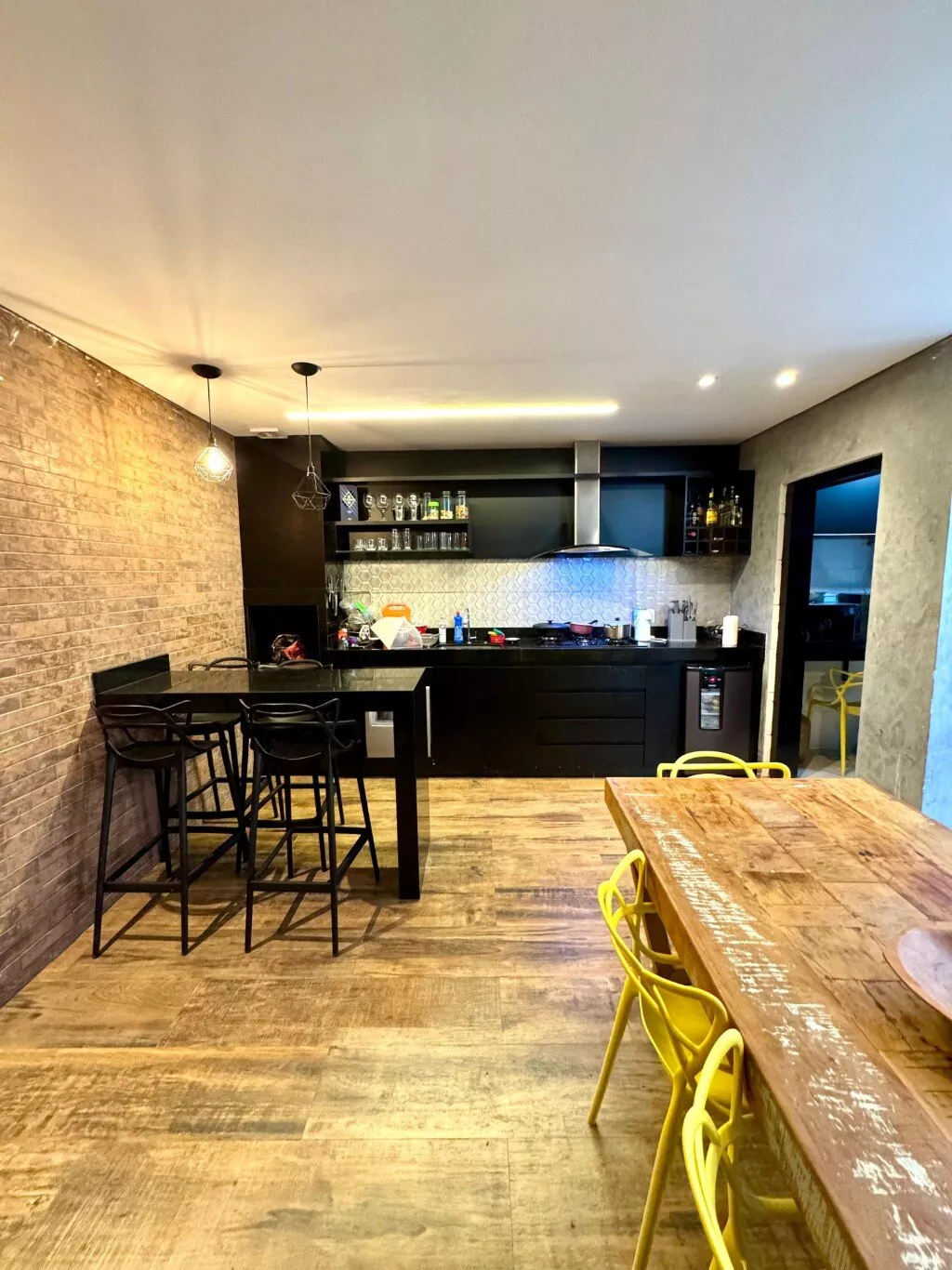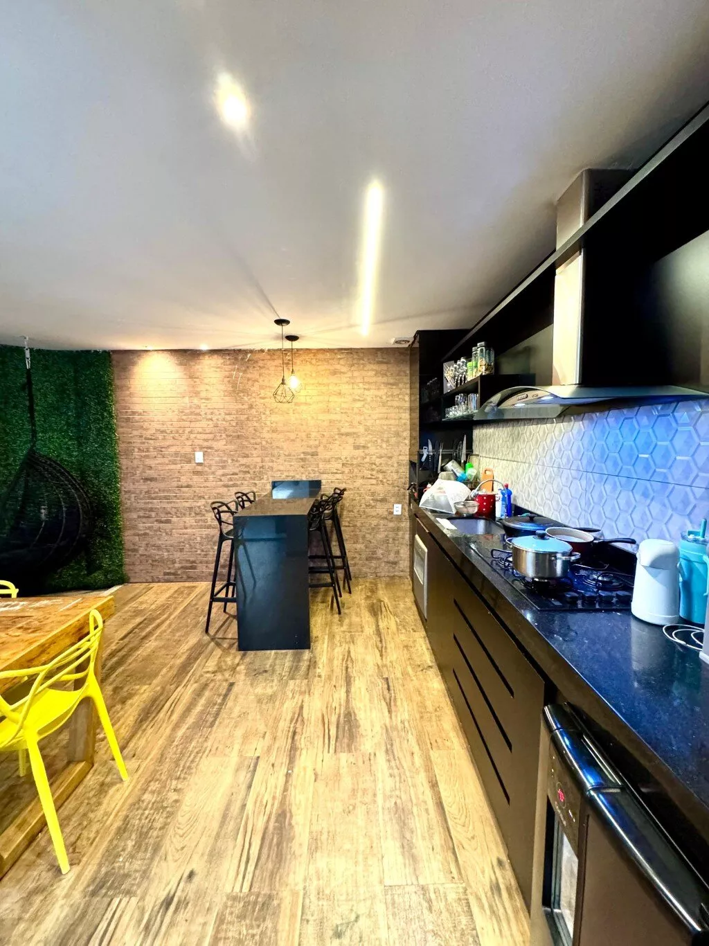 Belíssima área gourmet, com churrasqueira e armários planejados.